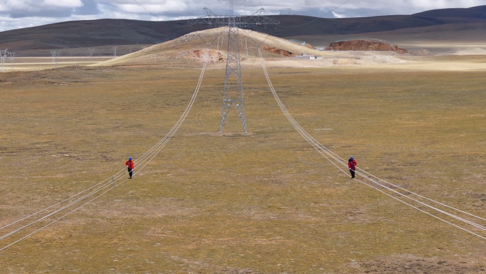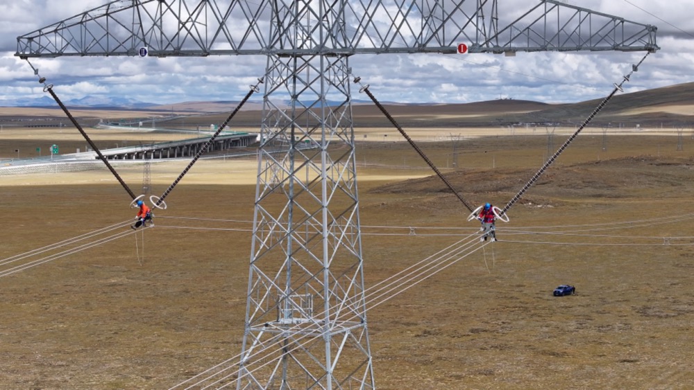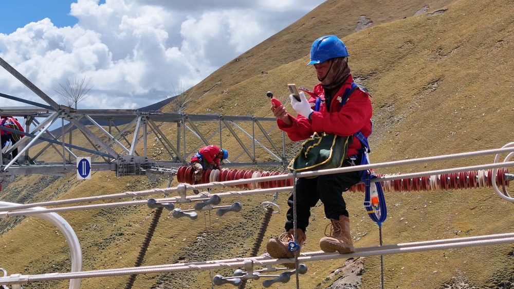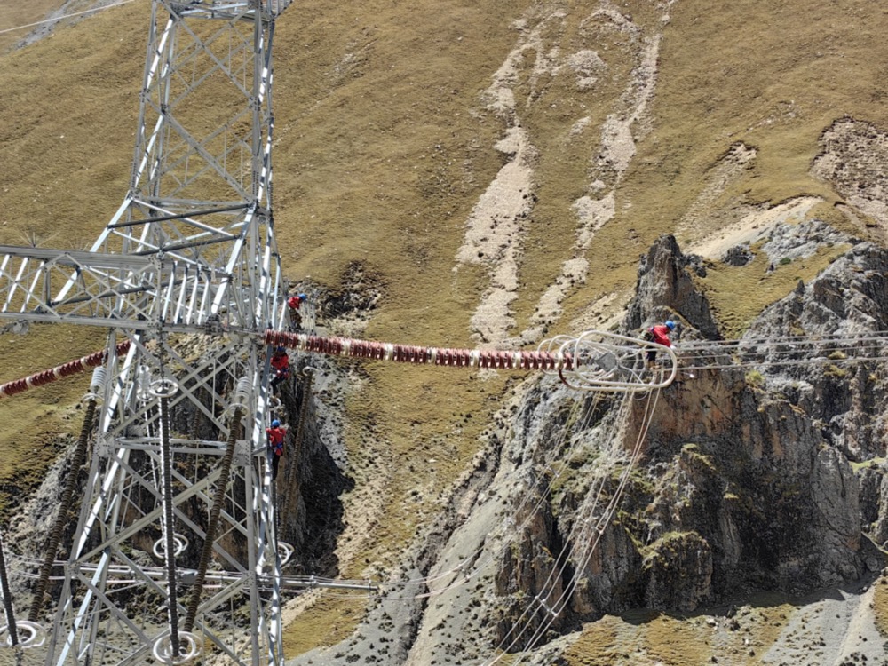 9月的林周,高原的阳光刺得睁不开眼。在走线现场,小组负责人扎西顿珠指挥两名工作人员上塔进行悬挂接地线,随后,两名走线人员顶着强烈的紫外线对2329号至2325号铁塔开展线路走线工作,在走线过程中,他们认真检查导线有无磨损、断股、严重锈蚀、外层损伤、零部件缺失等缺陷。现场走线组负责人扎西顿珠介绍:“在高海拔、大温差、强风沙的气候环境下,设备长期暴露在外,受到风吹日晒雨淋,为精准掌握设备状况,每年年检都要开展走线消缺工作。”