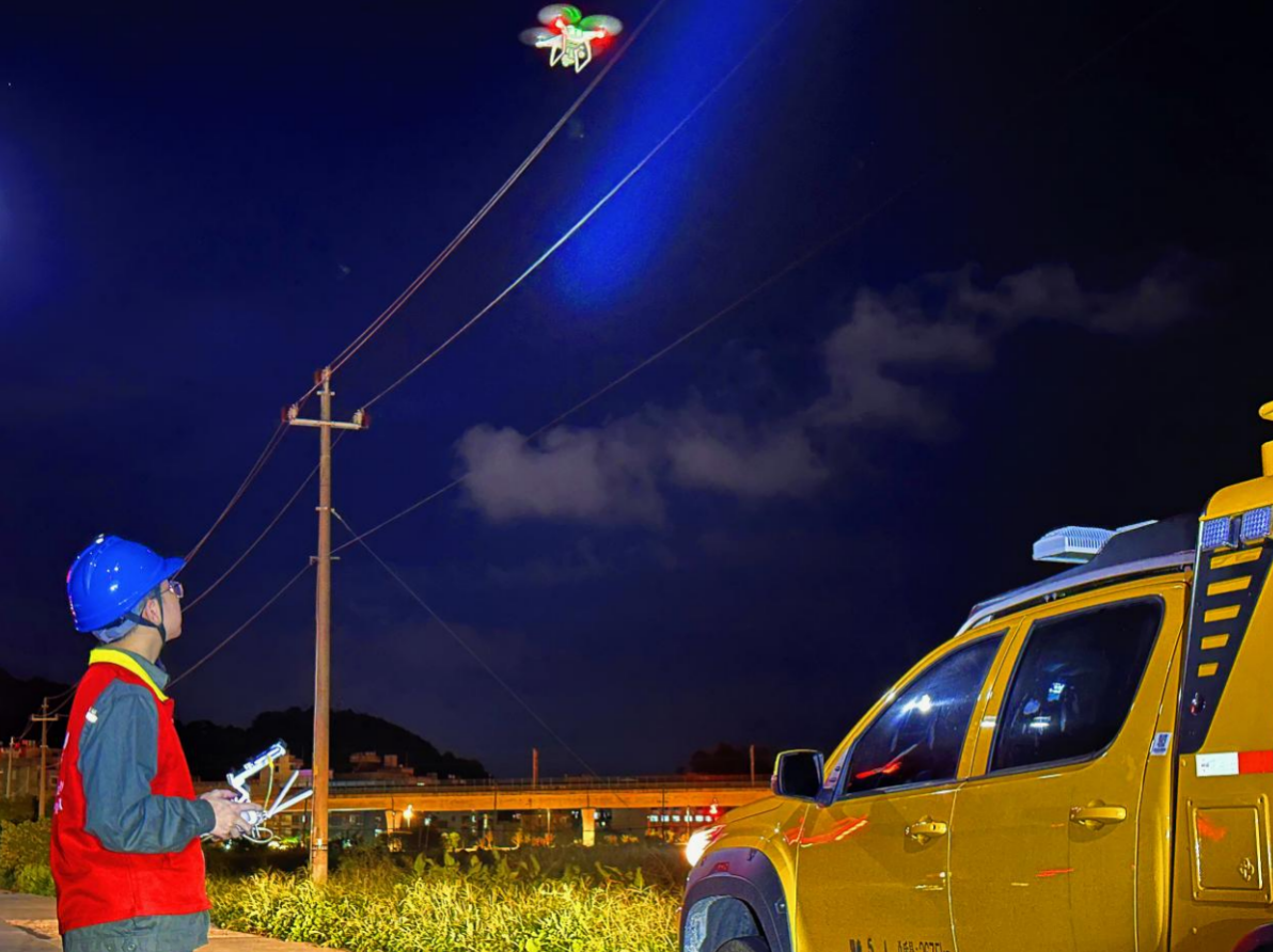 9月14日,国网乐清市供电公司员工在台风“贝碧嘉”来临前采用无人机对电力线路设备运行状态开展夜间特巡。章静 摄