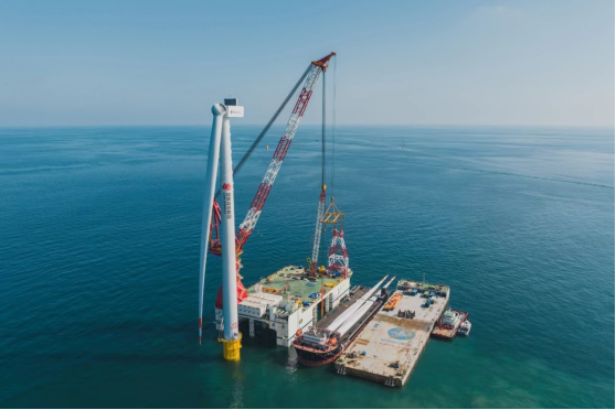 建设中的山东威海乳山半岛南海上风电U场址项目二期工程。(于腾飞 摄)