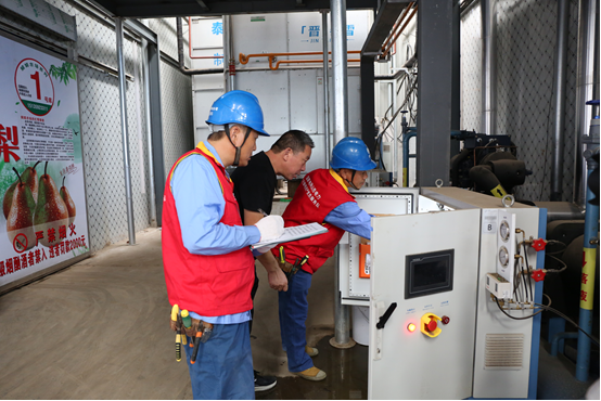 图为:国网运城盐湖区供电公司“电小田”服务队队员高泽文、李峰到盐湖区龙居镇长江府村娟娟家庭农场,帮助用户检查智能冷库用电设施。
