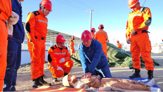 图为:邹立勋(右2)指导那曲公司开展紧急救护专项培训。