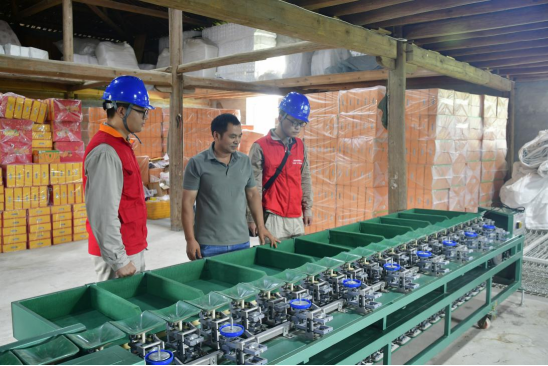 工作人员在仓库内协助果农检查选果机设备。