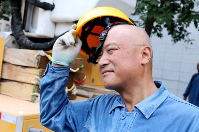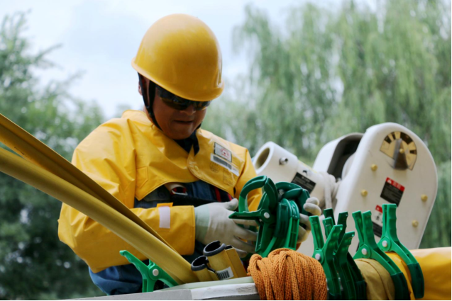 作业现场,工作人员全副武装,绝缘披肩、绝缘手套、护目镜、安全帽、安全带,一身黄色“战服”重达3公斤,厚重且密不透风。在这种炎热的天气下,工作人员要身着各种防护装备在高处持续作业1小时,辛苦不言而喻。随着绝缘斗臂车缓缓升起,两名工作人员被送到十多米高的高压线旁,他俩挤在1平米左右的绝缘斗里开始今天的消缺作业。半小时后,绝缘斗内的温度已骤升到37摄氏度,工作人员脸颊上的汗珠不停滑落,但他们没有丝毫疲劳懈怠,反倒是神情更加坚定、精神更加充沛,干劲十足,因为他们憋足了劲,一定要及早消除运行缺陷,确保配电线路安全可靠运行,他们要用汗流浃背的辛劳守护千家万户清凉。