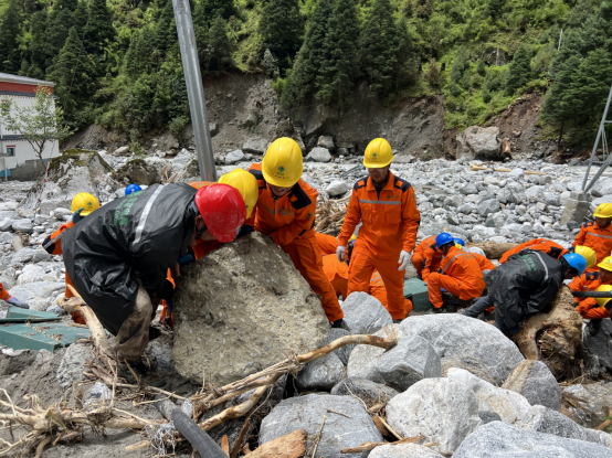 图为:7月15日,国网日喀则供电公司抢修队员在夏尔巴第一村现场检查压在石头下的电缆、并排查受损情况。卓玛杰/摄