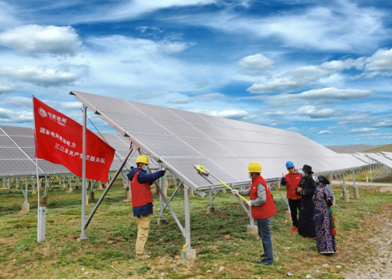 图为:国网果洛供电公司员工向牧民讲解光伏板日常维护(国网果洛供电公司供图)