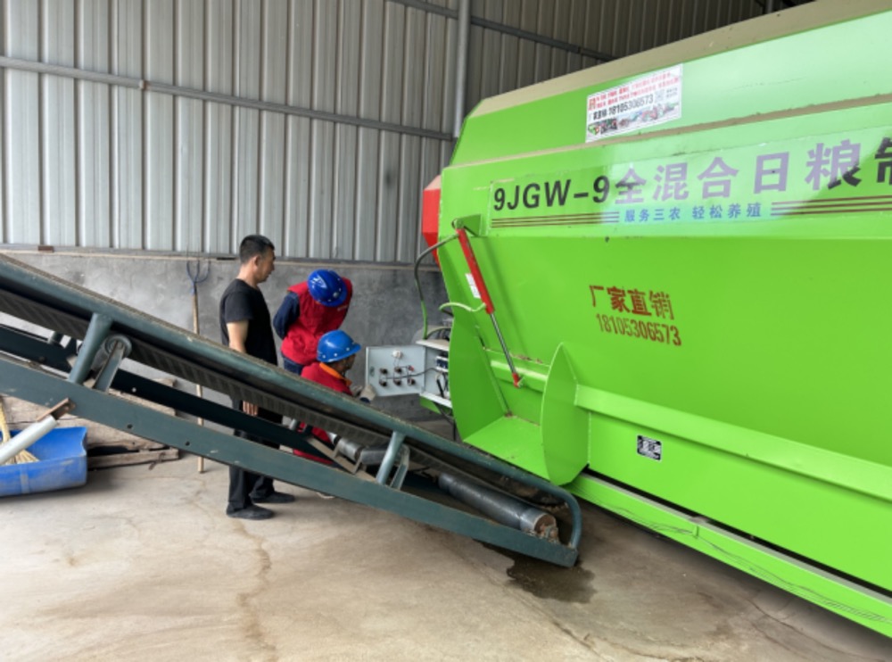 饲养员正开着铲车从混合上料机接取饲料,运送至固定式全混合日粮制备机进行自动化处理,制作成肉牛的“营养餐”。不远处的院子里,该公司工作人员党国良、苟海龙认真查看饲料机、粉碎机、排气扇及温控等用电设备的运行情况,义务检查和检修室内外用电线路、刀闸、插座等设备,现场测试漏电保护器,积极协助更换老旧破损线路开关,整改私拉乱接等违章用电现场,确保客户用电安全。