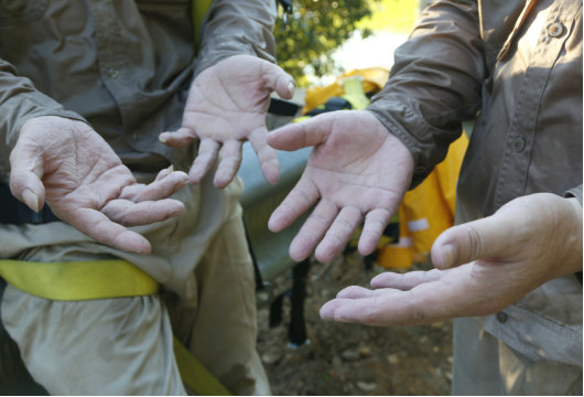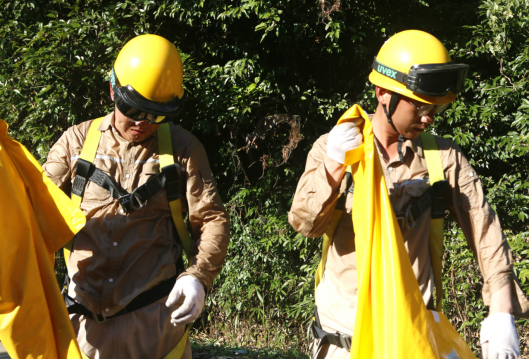 室外温度37度,空中作业时,加上厚重的防护服,空中作业一小时已浑身湿透,他们戏称“这比做桑拿还汗多”。他们轮班作业,趁着短暂的休息时间,抓紧喝水、擦汗、换衣服。虽然都有备用的工作服,换一套,这套晒干,然后等下个活干完,再换一套,一天下来至少要准备三四套衣服替换。