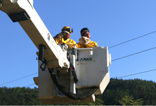 国网浦城县供电公司带电作业人员章文杰、陈邦华擦去脸上的汗水,继续作业。