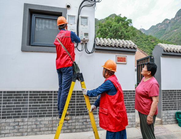 6月27日,国网北京门头沟供电公司妙峰山供电所员工李德亮、张立志到妙峰山镇桃园村检查用户表计。(石腾摄)
