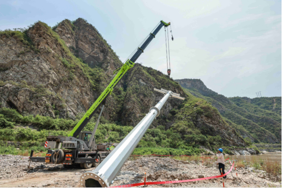 6月27日,在北京市门头沟区妙峰山镇下苇甸村正在开展10千伏上苇甸、岭角路防汛提升的钢杆组立工作。当日共计15人、1台25吨吊车投入施工。现场的安全警示标志和围挡格外醒目,电力工人们正在忙碌的进行设备安装,远处的起重机缓缓移动,巨大的机械臂精准地抓取电杆,准备将其稳稳地安放在挖好的坑基中。
