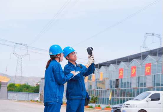 图为:国网兰州供电公司员工丁鋆、苗宇杰在甘肃兰州榆中县高原夏菜水培种植示范基地开展供电线路巡视。史双绚/摄