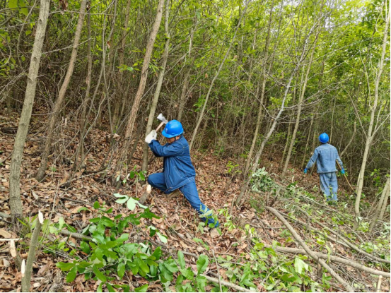 据了解,35千伏3511草石线27号杆至35号杆穿越赵家山国有林场,地形十分复杂,线路段植被茂密、杂草灌木丛生,就连前往巡线杆塔的羊肠小道也没有,巡线人员往往都是连爬带拽艰难行走在密林的陡坡上才能到达巡线目的地。当日,巡线人员详细检查了该线路段,包括杆塔基础、拉线、导线接头、绝缘子、弓子线等关键部位。为确保无死角、无遗漏掌握线路运行现状,他们身背测温仪、望远镜、砍刀、斧头、绳索和个人工器具,顶着烈日高温徒步对这部分线路进行巡视测温,同步清理线路通道树障。杨小宝介绍,“若要使用无人机巡视这9基杆塔,一个半小时就可以完成,但是线路通道两侧树木对无人机飞行存在一定影响,不能全方位、全视角掌握线路运行情况,当前正值‘迎峰度夏’电力保供和‘防汛’重要时期,只有采取‘人机结合+集中监控’的方式才能全面掌握线路运行现状,对我们后续开展树障清理、消缺除患、基础加固等工作提供准确的依据”。