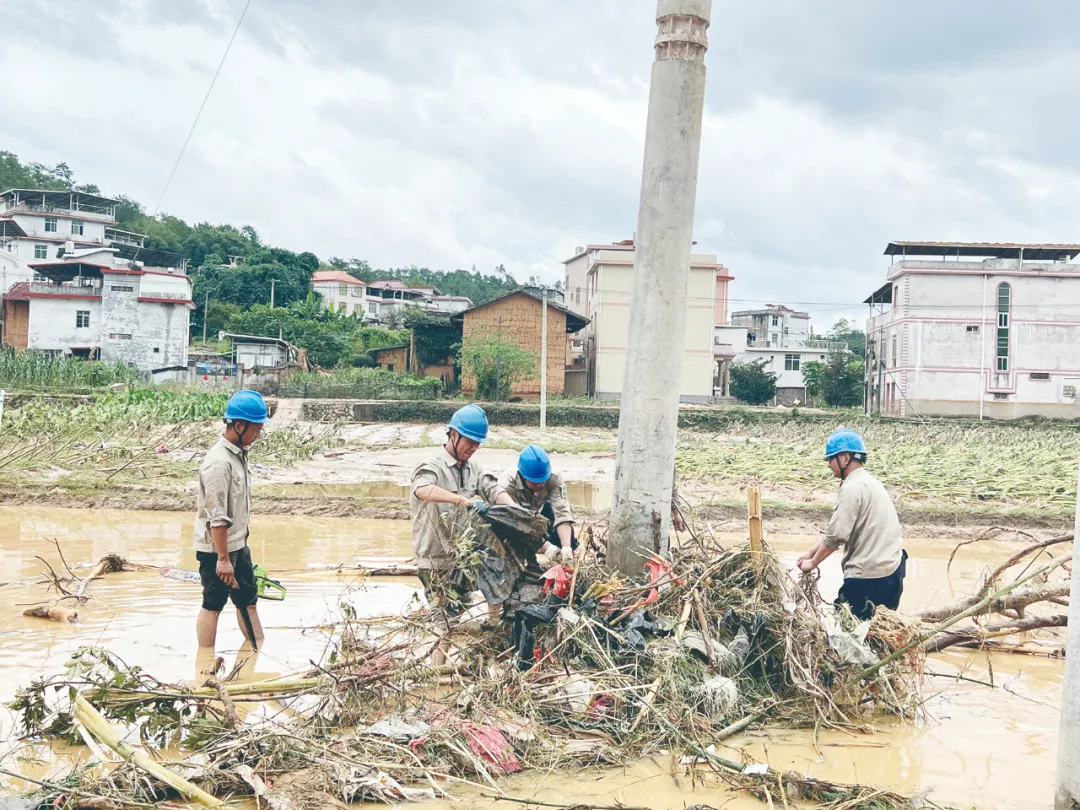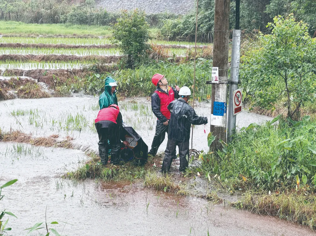 ▲图为6月15日,福建邵武市供电公司员工在抢修和平镇10千伏乌石县001塔至027杆间A相全失地故障。 郭慧超/摄