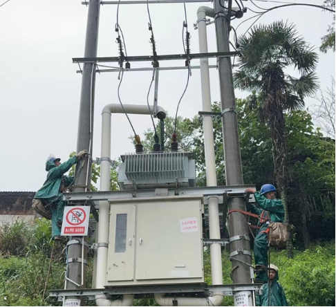 抢修人员到达故障现场后,工作负责人向大家交代了冒雨抢修过程中的注意事项及危险点,并进行作业分工,得到工作许可后,停电、验电、挂接地线、更换低压刀闸、吊变压器……抢修工作有序进行着。抢修人员顶着风雨在杆上将故障变压器卸下,随后又将新的变压器吊装上去,每个抢修人员的脸上都是一片片雨水和汗水混合的水渍。