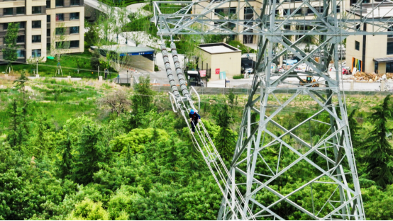 图为:高级工职业能力评价人员在进行六分裂导线走线检查导线及金具。