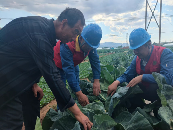 图为:国网兰州供电公司花庄供电所员工向种植户了解蔬菜长势及灌溉用电情况。陈正祥/摄