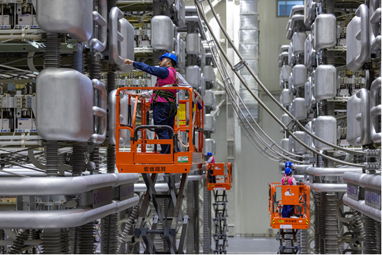图为:6月5日,在国网北京检修公司±500千伏延庆换流站年度检修现场,工作人员对设备进行检修作业。张笑谭/摄