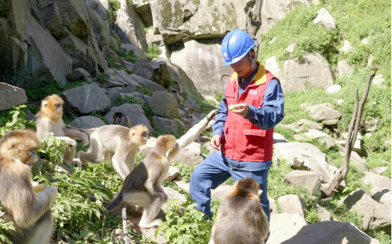 图为:国网陇南供电公司员工投喂川金丝猴。