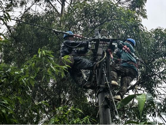 2日凌晨,暴雨引发的基础疏松将10千伏油车支线#2杆冲倒,线路失地故障告警。0时10分,电网抢修人员冒着大雨紧急将该支线开关由运行转冷备用,并在倒杆现场设置围网,首先确保过往群众的人身安全。现场雨幕笼罩,密集的雨点打在抢修人员的身上、脸上。为了不影响作业进度,他们眯着眼不让雨水和汗水流进眼睛里,手上的工作却从未停止。