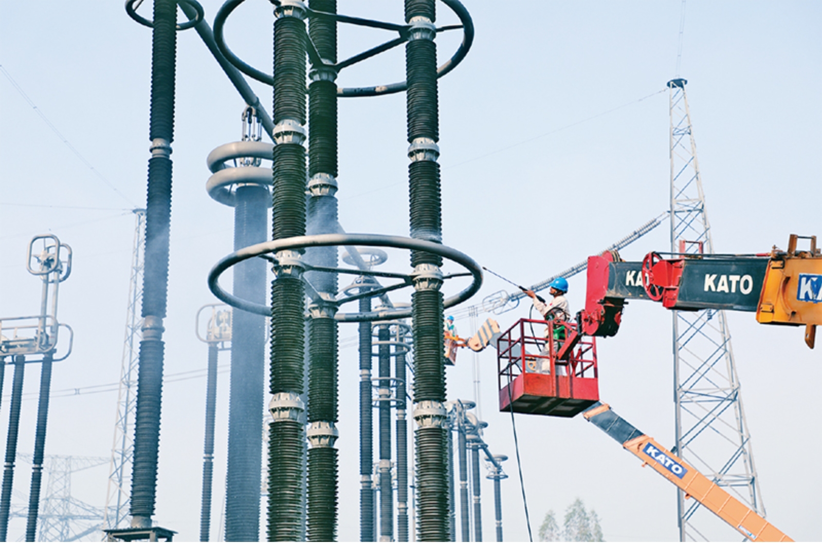 巴基斯坦默蒂亚里—拉合尔±660千伏直流输电工程,是中巴经济走廊优先实施项目和中巴经济走廊唯一电网项目,也是国家电网首个在国际上采用±660千伏直流技术方案投资、建设、运营一体化项目。图为2024年3月1日,该工程开展综合检修,工作人员在冲洗绝缘子。 国家电网党组宣传部/供图