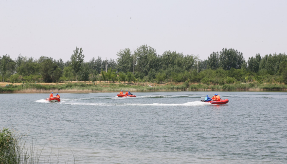 图为:供电公司员工现场实战演练水上人员和装备运输。王衍/摄