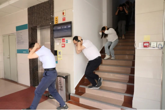 “呜!",随着警报声响起,生产大楼和工区大楼内各位职工们就近蹲或趴在办公桌等同时抓紧结实物体,用手或其它柔软物品等保护好头部。紧急避险结束后,职工们迅速猫腰、护头等听从指挥有序撤离到户外安全地点并集结完毕。
