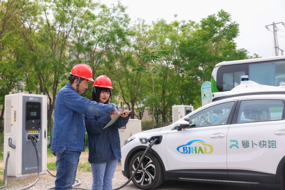 图为4月28日,国网北京亦庄供电公司人员到北京经开区某充电站进行设备巡视,保障新能源车主出行无忧。张庆玉/摄