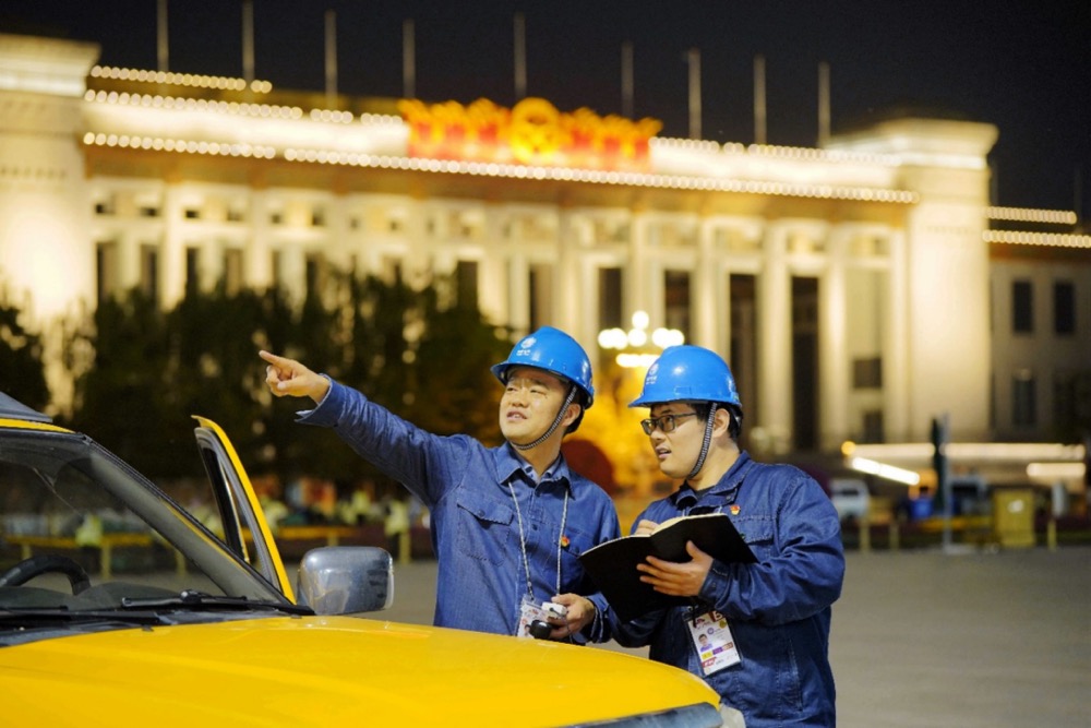 图为4月24日,国网北京照明中心华灯班班长及工作人员在天安门广场检修维护华灯设备。张超/摄