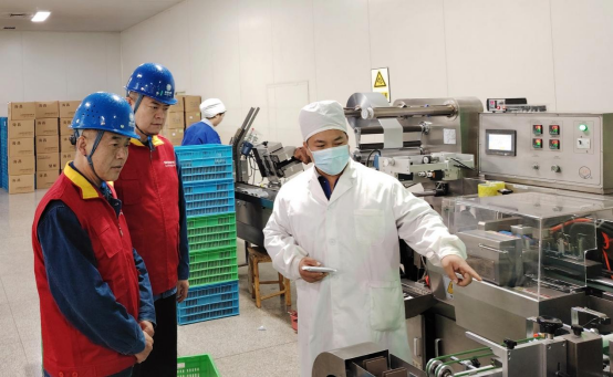 4月23日,在兰州太宝制药有限公司包装车间,国网兰州供电公司七里河供电分公司台区经理尹国林和同事了解客户药品生产情况和用电需求。李育东/摄