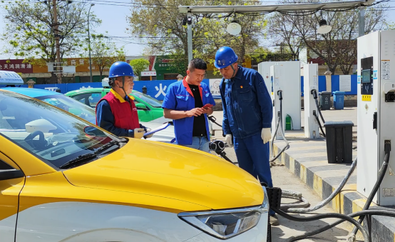 4月23日,国网兰州供电公司西固供电分公司客户经理丁东辉和高伟在西固区合水南路汽车充电站查看充电桩运行情况。伏亮亮/摄