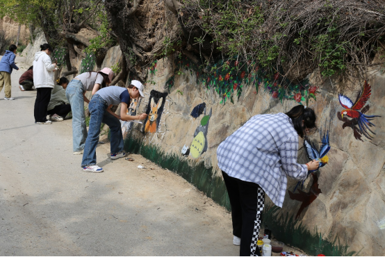 “我们的艺术实践要以山水花鸟为主,西和县这边的山体和我们去年写生实践的太行山山体结构有着明显的区别,大家对各地山势的认知程度也会有相应的区别,同学们用毛笔画的技法就会有明显区别……这是一次很好的机会,让大家亲身体会这些不同,欣赏不用的风景,感悟别致的文化习俗,了解目前乡村发展的现状和存在的问题,了解到乡村振兴工作的重要意义和给乡村带来的变化。只有这样用心去感悟,融情于景,才能让我们进一步提高自己的绘画水平。”带队老师一边向驻村干部介绍,一边指导学生李慧玲用画笔将围栏与野菊菌的故事画在墙上。