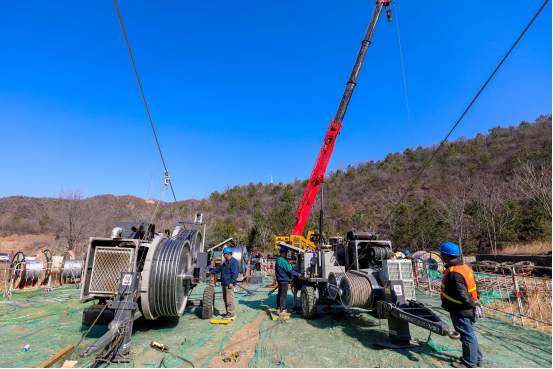 国网北京门头沟供电公司110千伏清水输变电工程导地线展放施工现场。(张文静 摄)