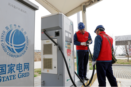 国网潍坊供电公司员工对高速公路服务区充电设施进行巡视。(李文博 摄)