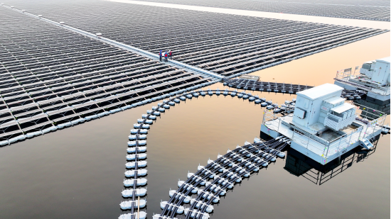 济宁供电公司员工到兖州区采煤沉陷区水面光伏发电项目现场开展服务。(李军 摄)