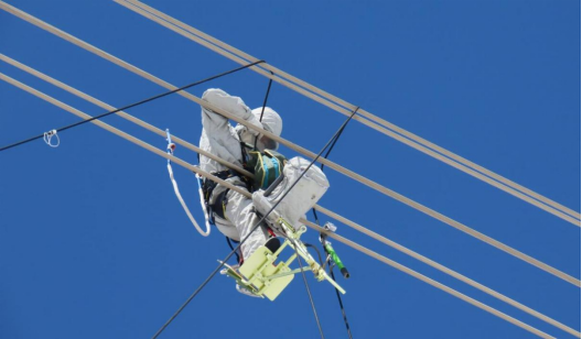 带电作业人员在工作负责人、安全监护人的监督下,对绝缘工器具、安全帽、绝缘面罩、绝缘服、绝缘手套、绝缘靴等进行了各项检测,在得到许可后有条不絮地开始工作。在作业过程中,该公司作业人员严格按照各项安全防范措施及高空作业安全规程开展作业,无人机飞手在确认无人机运行状态良好后,操控携带绝缘牵引绳的无人机起飞,将绝缘牵引绳抛到指定导线上并操控无人机飞出设备区平稳降落至地面。随后,“小飞人”将带电作业人员升至线路两米处,带电人员申请进入等电位作业,得到批准后,作业人员将电位转移棒挂到导线上开始带电作业。