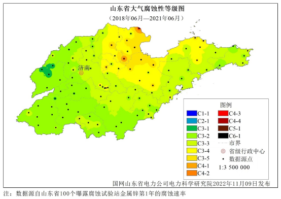这一切要归功于国网山东电科院电网材料腐蚀与防护团队。该团队在国网山东电科院首席专家李辛庚与核心成员杜宝帅、樊志彬的带领下,已然孜孜不倦地开展此项研究十余年。日前,我国首个大气腐蚀图国家标准《大气腐蚀图绘制方法》通过了国家市场监督管理总局(国家标准化管理委员会)批准,正式发布,这是近期该团队取得的全新成果之一。此项成果正逐渐点亮全国多个网省的动态大气腐蚀图,实现了输变电设备的腐蚀状态有据可依,有效可控。