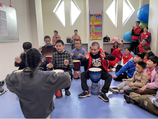 当孩子们知道志愿者们将来到服务中心的消息后,自发地准备欢迎仪式。随后,孩子们为志愿者们带来了一首《骄傲的少年》非洲鼓表演。激昂欢快的鼓声从教室内响起,现场的志愿者们从鼓声中感受到孩子们面对的生活不易却奋勇向前、积极乐观的态度。