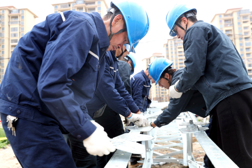 国网莆田供电公司施工人员在莆田黄石镇小微产业园组装铁塔,为后续移杆改线工程做准备。朱清霞/摄