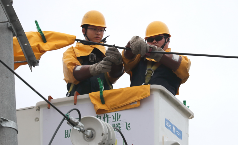 3月4日,国网莆田供电公司带电作业人员正在开展10千伏清桥线小微产业园分支线007号杆带电搭接作业,为小微产业园的企业客户送电。