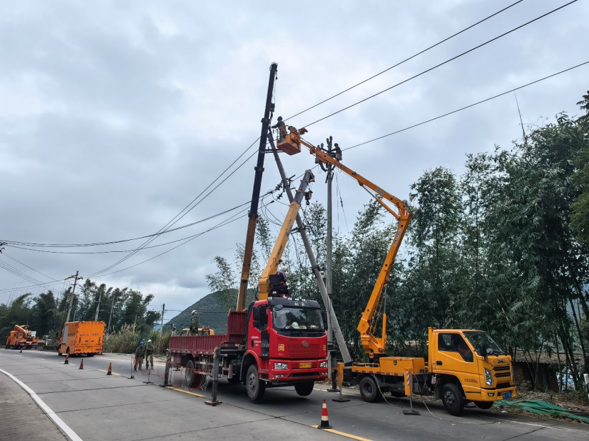 经现场勘查,发现10千伏南溪线36号杆被一辆汽车撞击,导致断裂倾斜,连带着周围多基电杆导线均遭受不同程度的损坏,需要立即进行抢修。由于事发路段位于主干道,来往车辆较多,太平供电所工作人员一面在现场设置隔离标志,防止行人误入,一面迅速与公司运检申请抢修、人员及物料援助。9时许,国网延平区供电公司带电作业车、吊车、挖掘机陆续到位,在采取好临时安全措施后,抢修人员在带电作业车和吊车协助下将断杆上的线路拆除下来,然后在原杆位置用人工重新开挖杆坑。