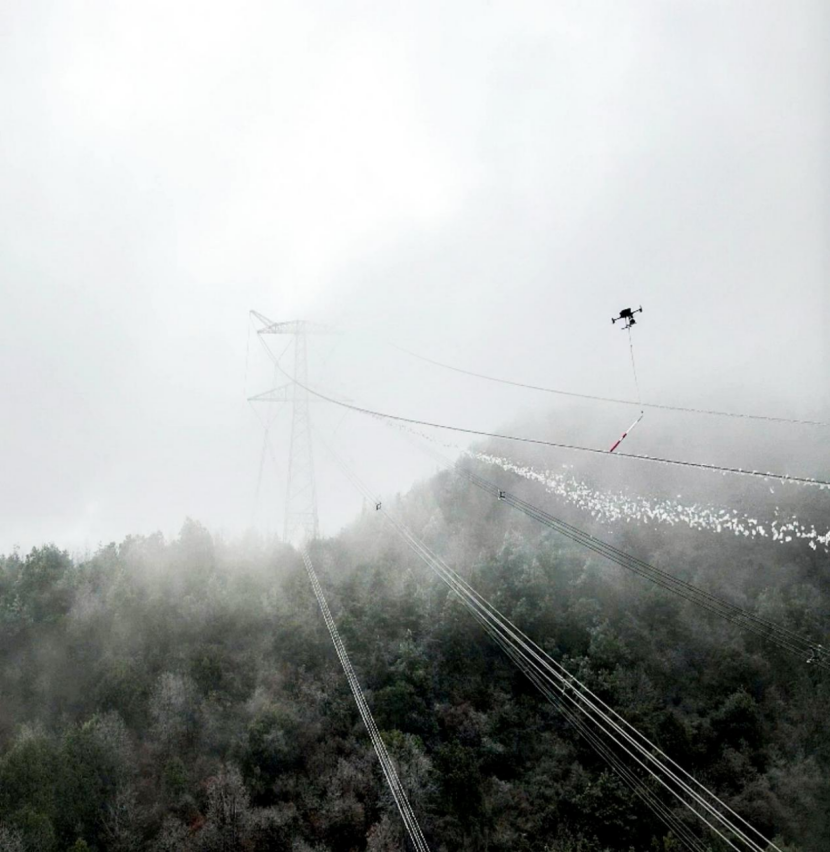 2月25日,南网超高压公司柳州局员工使用无人机带绝缘棒撞击方式清除架空地线覆冰。黄志欢/摄
