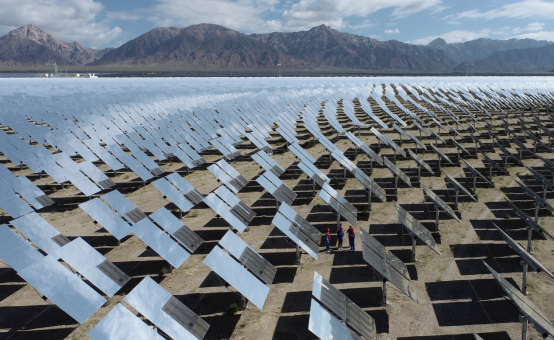 图为青海省海西州多能互补集成优化国家示范工程基地光热电站,电网员工上门了解企业发电情况。