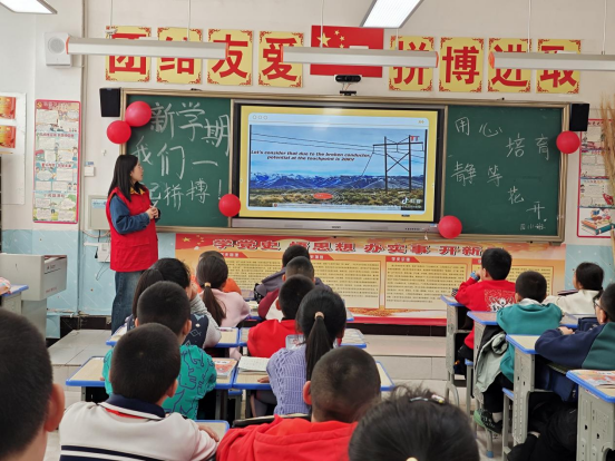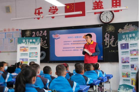 国网瓜州县供电公司张晨在瓜州县第一小学开展青春光明行活动。(马跳 摄)