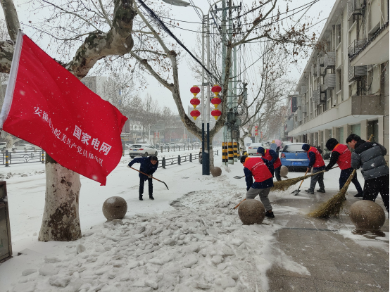 图为2月21日,国网濉溪县供电公司皖美党员服务队清除营业厅门口积雪,方便用户办理业务。(艾传坤 摄)