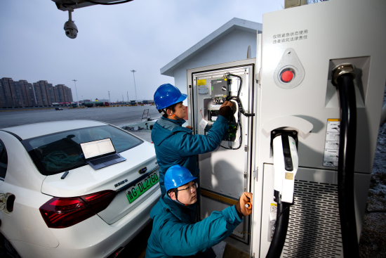 2月4日,国网淄博供电公司工作人员维护高速公路服务区充电桩,服务春节返乡车主及时充电。远德亮/摄