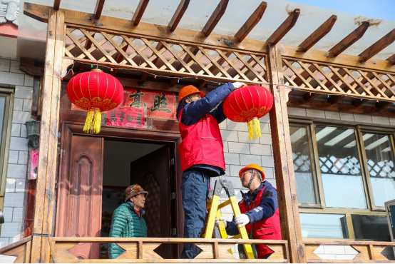 2月6日,国网北京门头沟供电公司妙峰山供电所员工在炭厂村开展春节保电走访,到独居老人家检查“煤改清洁能源”用电设备,帮助挂红灯笼。(张文静 摄)