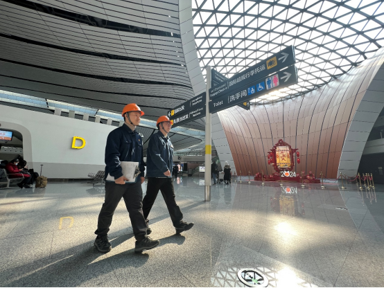 国网北京大兴供电公司机场供电服务中心员工姚俊峰、卢祎特在大兴机场航站楼内开展节前用电检查工作,全力确保春节期间大兴机场平稳运行。(张章/摄)
