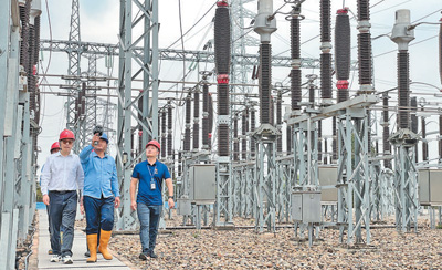 中老技术人员在万象郊区的230千伏纳塞通变电站开展日常巡检工作。