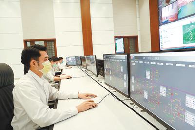 在老挝南欧江梯级水电站集控中心,中老两国员工监测发电站设备运行。