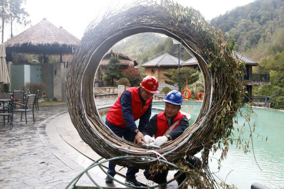 练继伟一行为景区包扎灯带接线。(叶凌云 摄)